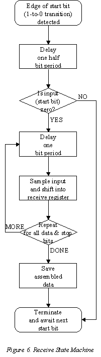 The serial receiver is somewhat more complicated than the transmitter, since it must establish the timing of the incoming data. Figure 6 shows the logic of the receive service routine.