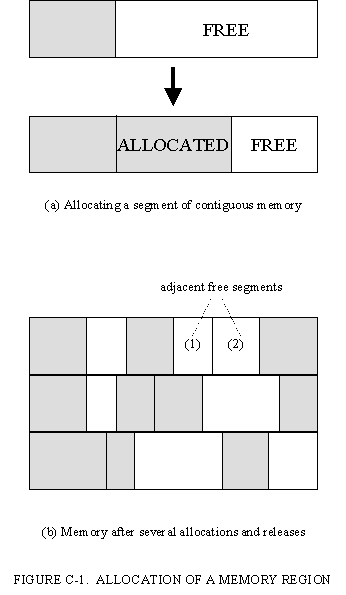 After the free space is subdivided in this manner several times, and some of the allocated regions are "released" (designated free), a picture similar to Figure C-1b will form.