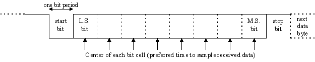 A transition from 1 (stop bit or "idle" state) to 0 always signals the start of a new character. To ensure that this is a valid start bit, and not a momentary glitch on the input line, the receiver delays for one-half a bit period -- to the center of the bit cell -- and then samples the input pin again. If this is a valid start bit, the input will still be zero.
